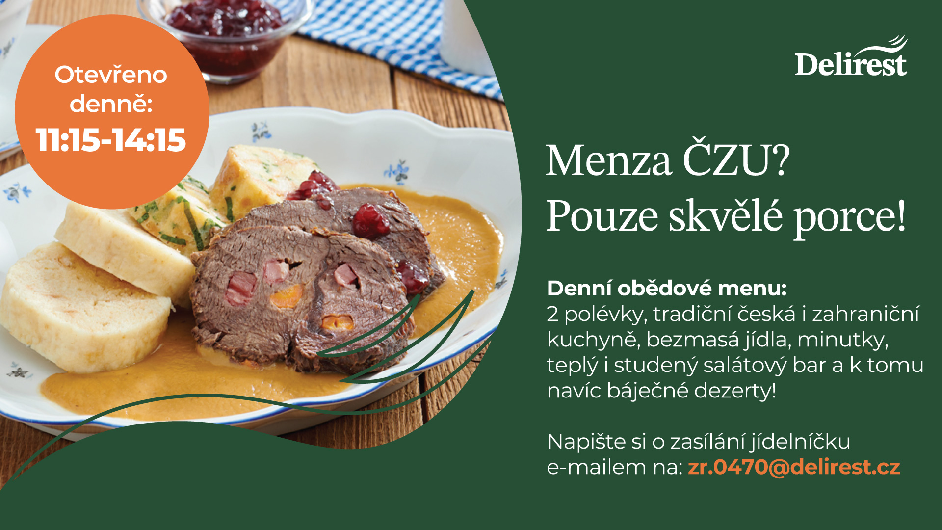 Současným provozovatelem menzy České zemědělské univerzity v Praze je polečnost Delirest services s.r.o. Provozovatel zajišťuje stravování studentů, zaměstnanců a ostatních hostů. Kompletní nabídka včetně systému "dotací" pro studenty je uvedena v přiloženém souboru.