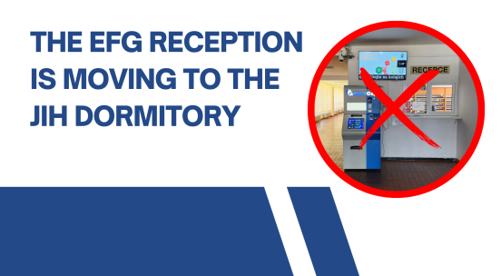 The reception desk at the dormitory EFG will be closed from November 1, 2025. All matters that you have previously handled here will now need to be dealt with at the reception desk at the dormitory JIH